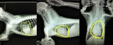 上圖中分享的依然是剛才的兩只犬的三張X光片,但是重點不一樣,通過圖片畫圈的位置可以發現,第一只犬是主要由于氣管狹窄,通氣不足引起的喘氣急促。第二張圖片,圖片中心臟的面積幾乎占了整個胸腔的一半,形狀也有明顯的異常,而氣管并沒有明顯異常影像,另外通過醫生的聽診和第三張不同體位的X光片的檢查分析,可確診此犬患有心臟病。X光片的確診對于心臟病十分重要,醫生會通過專業的測量和計算來判斷心臟病的類型和嚴重程度。
