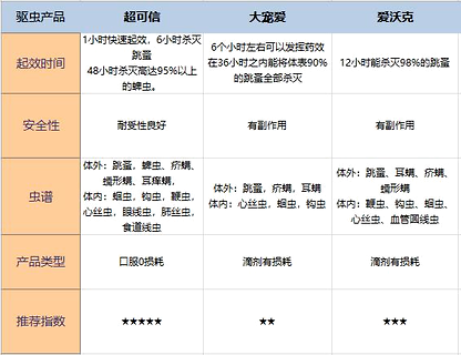 綜上,超可信的起效時(shí)間最快,對(duì)于狗狗驅(qū)蟲的殺滅率高,蟲子不容易出現(xiàn)反復(fù)的情況。而大寵愛和愛沃克起效沒有超可信快,而且對(duì)于跳蚤等繁殖快的蟲子無法徹底消滅。