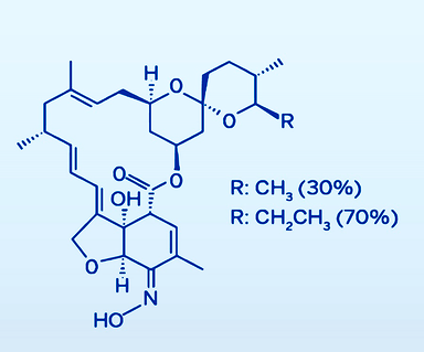 米爾貝肟(2C32H45NO7.2C31H43NO7),作為殺線蟲藥物在犬上應用具有非常好的安全性,通過激活谷氨酸鹽受體控制的氯離子通道,增加氯離子流入神經細胞內,導致寄生蟲肌肉麻痹死亡,不會有副作用。可以驅殺主要的消化道線蟲,能夠預防心絲蟲。米爾貝肟對于體內外的寄生蟲都有很好的驅殺作用,并且對于阿維菌素類敏感的犬毒性比較小。