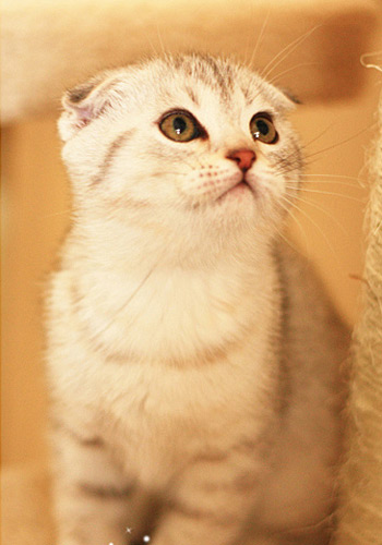 蘇格蘭折耳貓剛出生的時候耳朵并不是折著的。大約三到四周大的時候,它們的耳朵才開始下折……或者就干脆不下折!直到小貓11周到12周大的時候,繁育者 才能大致判斷出它們的品相(寵物 級,繁育級還是賽級)。目前,只有耳朵折下來的折耳貓才能參加比賽,當然,每個繁育者都希望繁育出能參加比賽的貓。但是立耳的折耳貓在繁育過程中的價值卻是無價的。(圖片來源: PConline 攝影部落)
