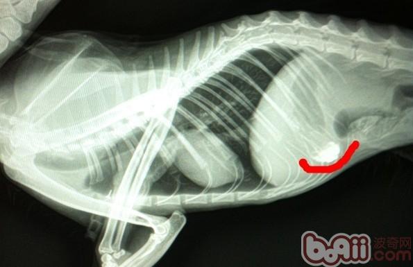 此片攝于患貓灌入鋇餐20小時后,正常情況下,鋇餐應完全通過胃區,通過腸道,應幾乎排空,顯然此片中胃區任有少量殘余液體,腸道內幾乎排空,反映出雖然消化道沒有完全堵塞,但胃排空較慢,腸道蠕動減慢,因此貓為長毛貓,消瘦,主人常年在外缺乏管理,不能提供足夠的病情資料,與主人溝通后,采取保守治療,通過支持療法和食物緩瀉療法,此貓逐漸排除體內伴有大量毛發的干燥積便。