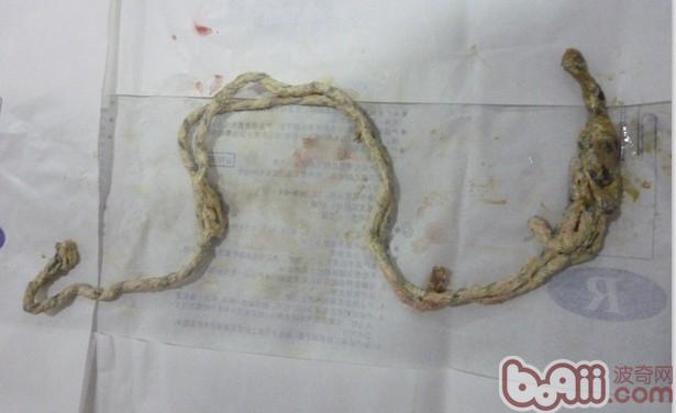 此為上文中提到的貓咪誤食的大閘蟹扎線,看似柔軟,但是這樣的線粗且長,經過腸道蠕動后更容易在腸道中堵塞,圖片中的線在鋇餐造影以后確定位置,手術治療,10天后貓咪逐漸恢復正常。