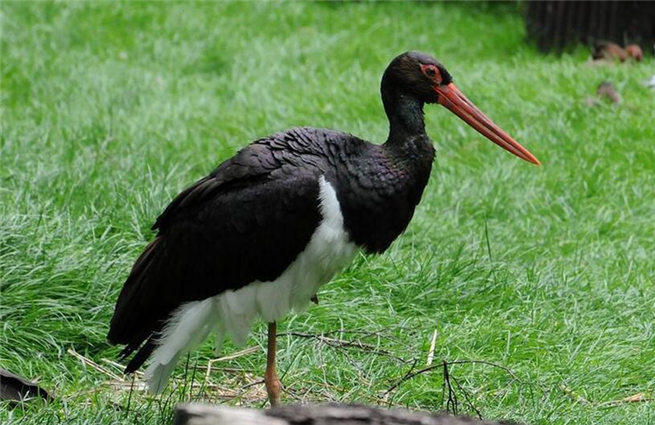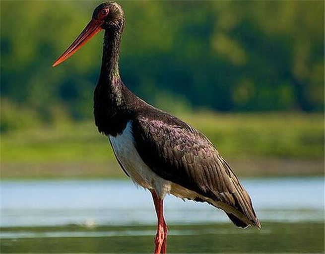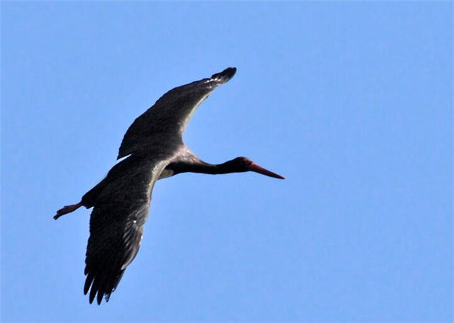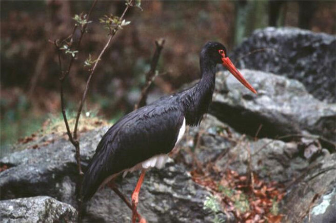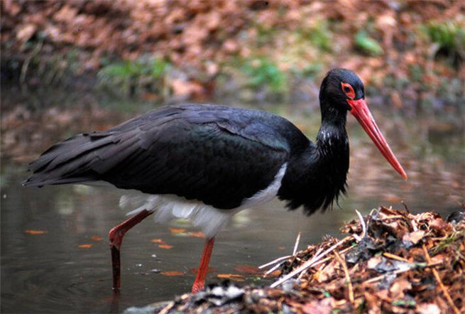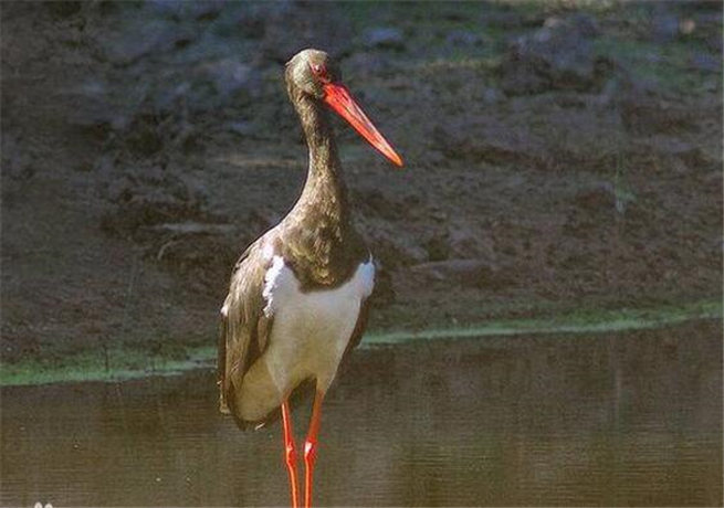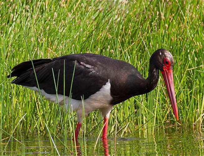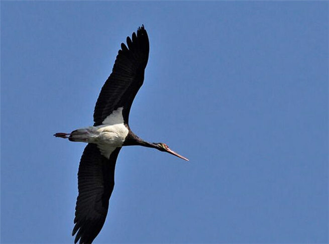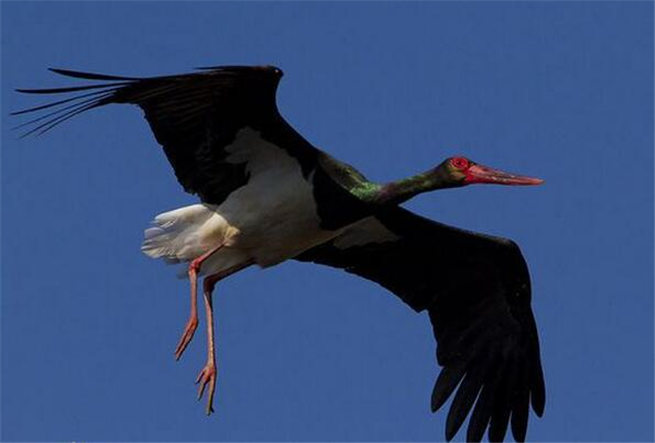 習性:性孤獨,常單獨或成對活動在水邊淺水處或沼澤地上,有時也成小群活動和飛翔。白天活動,晚上多成群棲息在水邊沙灘或水中沙洲上。不善鳴叫,活動時悄然無聲。性機警而膽小,聽覺、視覺均很發達,當人還離得很遠時就凌空飛起,故人難于接近。在地面起飛時需要先在地面奔跑一段距離,用力扇動兩翅,待獲得一定上升力后才能飛起,善飛行,能在濃密的樹枝間飛翔前進,飛翔時頭頸向前伸直,兩腳并攏,遠遠伸出于尾后。兩翅扇動緩慢有力,平均每分鐘兩翅扇動159次,比白鸛每分鐘鼓動170次還慢。黑鸛不僅能鼓翼飛行,也能像白鸛一樣利用上升的熱氣流在空中翱翔和盤旋,頭可以左右擺動觀察地面。在地上行走時跨步較大,步履輕盈。休息時常單腳或雙腳站立于水邊沙灘上或草地上,縮脖成駝背狀。