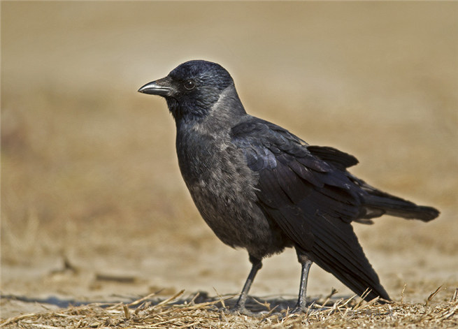 體型略小(37厘米)的黑色及灰色鴉。嘴小且短。與家鴉區(qū)別在體型較小,嘴細(xì)小,虹膜藍(lán)色。達(dá)烏里寒鴉幼鳥色深而少反差,虹膜色深,眼后具銀色細(xì)紋。寒鴉幼鳥也具深色的眼及深灰色區(qū)域但耳羽無銀色細(xì)紋。虹膜-藍(lán)色;嘴-黑色;腳-黑色。