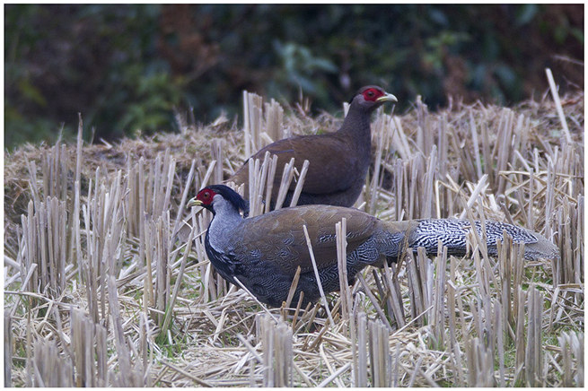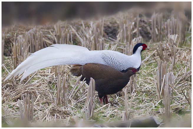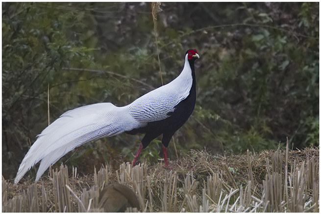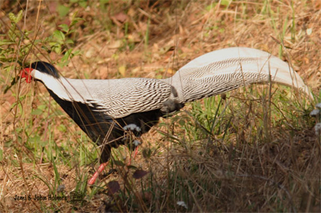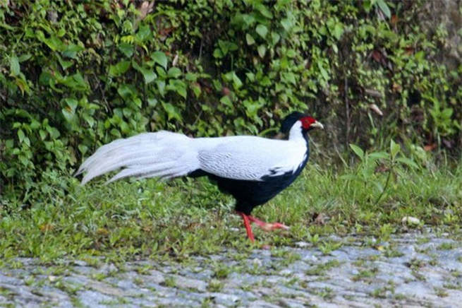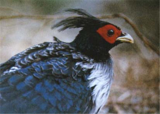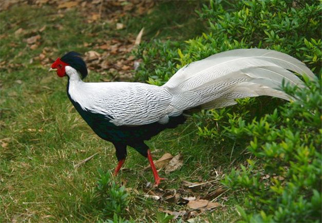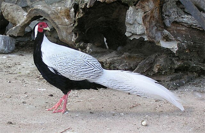 雄鳥:頭上羽冠及下體藍黑色;臉裸露,赤紅色。上體和兩翅白色,自后頸或上背起密布近似‘V’字形的黑紋;黑紋的多寡,粗細以及顯著與否隨亞種而不同。尾甚上,白色,尾的長短、其上有無黑紋、黑紋的多少,亦隨亞種而不同,是亞種的另一鑒別特征之一。 雄鳥羽色不同于其他雉類的絢麗華美,而是一身銀裝素裹。它的頭上具有長而厚密,狀如發絲的黑色羽冠,并披于頭后;臉部裸出,呈鮮紅色;整個下體都是烏黑色;上體和身體后面長長的尾羽,都是潔白的襯底上密布著細細的“V”字形黑紋。尤為別致的是,尾羽上的黑紋越向后越小,逐漸消失。[1]