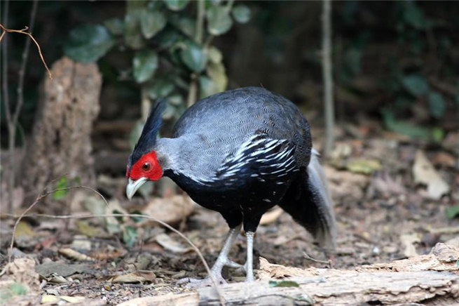 白鷴(學名:Lophura nycthemera)又名白雉。屬于大型雞類。雄鳥全長100-119厘米,雌鳥58-67厘米。頭頂具冠。嘴粗短而強壯,上嘴先端微向下曲,但不具鉤;鼻孔不為羽毛所掩蓋著。翅稍短圓。尾長。跗蹠裸出,雄性具距,但有時雌雄均有;趾完全裸出,后趾位置較高于他趾。雌雄異色;雄鳥上體白色而密布以黑紋,頭上具長而厚密、狀如發絲的藍黑色羽冠披于頭后;臉裸露,赤紅色;尾長、白色,兩翅亦為白色。下體藍黑色,腳紅色。雌鳥通體橄欖褐色,羽冠近黑色。棲息于森林茂密,林下植物稀疏的常綠闊葉林和溝谷雨林。食昆蟲、植物莖葉、果實和種子等。通常成對或成3-6只的小群活動,性機警,很少起飛,緊急時亦急飛上樹。繁殖期筑巢于灌木叢間的地面凹處。每窩產卵4-6枚,雛鳥早成性,孵出的當日即可離巢隨親鳥活動。分布于中國、緬甸、泰國和中南半島。
