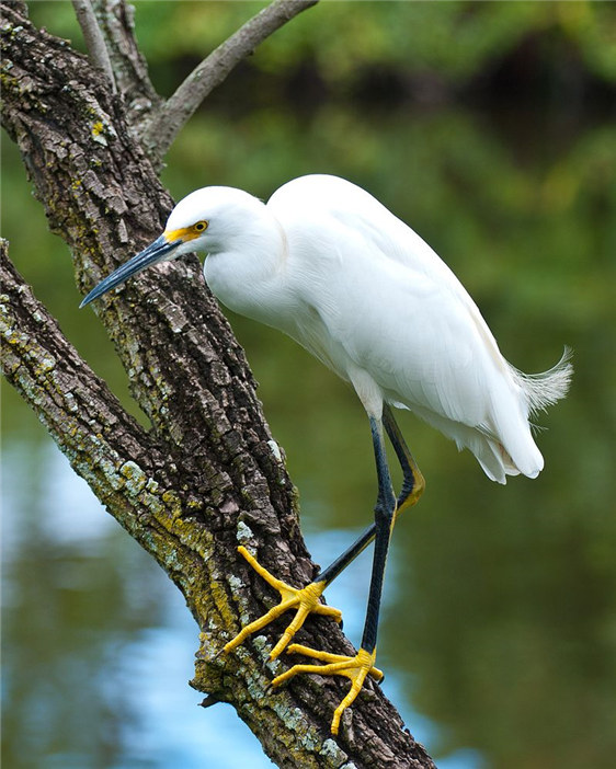 雪鷺是一種小型涉禽,身長55~65厘米,體重375 g。全身潔白的羽毛,頸背有絲狀蓑羽。有一雙亭亭玉立黃色長腿和一個黑色的鳥喙。在繁殖季節(jié),鼻孔和眼睛之間的區(qū)域會由黃色變成紅色。幼鳥類似鳥,喙基略蒼白,腿有背部綠色,黃色有黃絲狀羽毛。嘴長而尖直,翅大而長,腳和趾均細長,脛部部分裸露,腳三趾在前一趾在后,中趾的爪上具梳狀櫛緣。雌雄同色。體形呈紡錘形,體羽疏松,具有絲狀蓑羽,胸前有飾羽,頭頂有的有冠羽,腿部被羽。