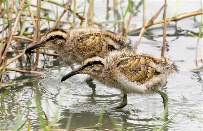 剛孵出來的彩鷸寶寶就已經有絨毛且能到處跑,這樣就可以自己覓食了。仍有絨毛的彩鷸寶寶是淺黃褐色的,頭上和身上有黑色縱紋;褪掉絨毛長出羽毛后,未成年的幼鳥則與它們的父親長相相似。一旦外界有危險,和其他鸻鷸類的鳥兒一樣,彩鷸爸爸會把寶寶們護在翅膀和腹下(只不過其他種類多是媽媽護著寶寶)。[