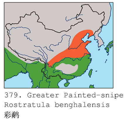 彩鷸雄鳥眼先、頭頂至枕黑褐色,頭頂中央暗黃色,形成一黃色中央冠紋。后頸和肩淡褐色,肩羽外緣暗黃色,其余為暗黃色,棕黃色,黑色和灰色相雜狀。肩間和內側三級飛羽羽色和肩相似,但無黃色羽緣。背至尾上覆羽和尾羽灰色,具細窄的黑色波狀紋和暗黃色眼狀班。初級覆羽灰色,具細窄波狀斑和暗黃色眼狀斑,內側小覆羽與背同色,其余翅上覆羽和三級飛羽外露部分為橄欖黃色,具細窄的黑色橫紋和寬著的暗黃色橫斑;初級飛羽和次級飛羽外側基部黑色,余為灰色,具白色橫斑和暗黃色眼狀斑與黑色波狀紋。眼周圍一圈黃白色或黃色紋,并向眼后延伸形成一柄。白色眼圈外再緣以黑色;耳覆羽黑色。頦、喉白色,其余頭和頸部綴有白色和褐色小斑點。頰至上胸灰褐色,胸腹之間界以黑色橫帶,胸至背肩部有一寬的白帶,下胸至尾下覆羽白色。