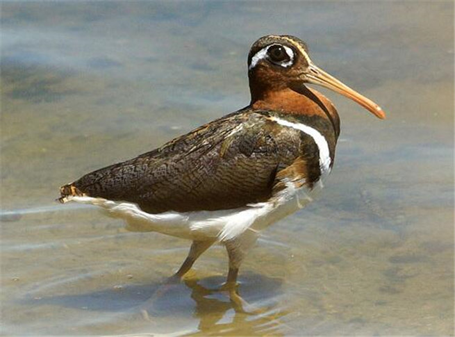 彩鷸屬于中等大小(體長約25cm)的鸻鷸類(在河邊海灘看見的鸻鷸多半都比它小得多,一大群小鳥鳥跑來跑去什么的),喙較長,橙黃色,尖部略下彎。雌鳥色彩艷麗,一般不會認錯;其頭、頸至胸部栗色,頭頂和胸部羽色較深,近黑色,具淡黃色頂冠紋(頭部正上方的縱紋,一般要在正對著鳥頭時才看得見),眼周白色并向后延伸(有點兒像鴛鴦的雌鳥),背部及兩翼褐色,腹部白色。雄鳥體型較雌鳥小,羽色亦較黯淡:頭、頸及胸部與背部同為褐色,并綴以淡黃色斑點。[4]