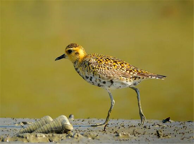 金鸻嘴形直,端部膨大呈矛狀。冬羽:上體滿布褐色、白色和金黃色雜斑;下體亦具褐、灰和黃色斑點。飛行時,翅尖而窄,尾呈扇形展開。夏羽:額白色,向后與眼上方寬闊的白斑匯合,向下與胸側相連;上體余部淡黑褐并密雜以金黃色點斑;下體從喉至腹呈黑色。腋羽灰褐色。后趾缺如。