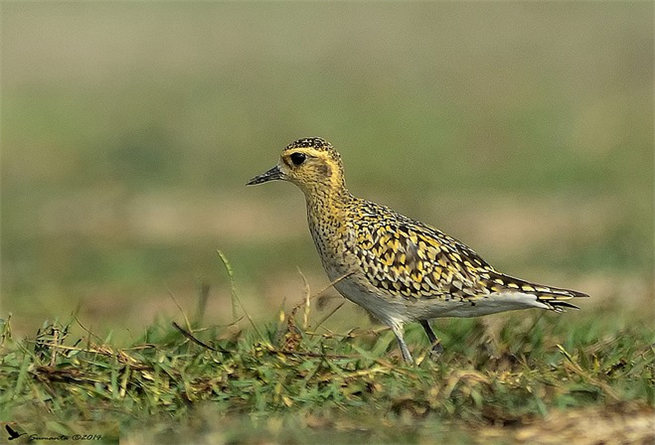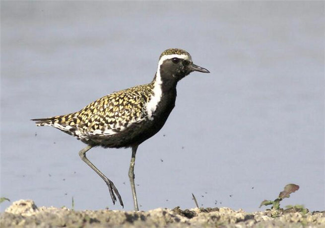 成鳥(繁殖羽):額基棕白,向兩側與白色眉紋相連;頭、后頸、背至尾上覆羽黑褐色,滿布金黃和淺棕白色點斑,尤以金黃色點斑為濃著;尾羽具黑褐與淡棕白色相間的橫斑;初級和次級飛羽黑褐色;翅上大覆羽黑褐色,羽端綴白;翅上小覆羽和三級飛羽與背同色;頸側的白色與眉紋貫通,并向下延伸至胸側;頰、頦、喉至下胸和腹部中央黑色;兩脅、肛周羽和尾下覆羽淡棕白色,具黑色及灰褐色雜斑;腋羽褐灰色,羽端綴白;翼下覆羽淺褐色。