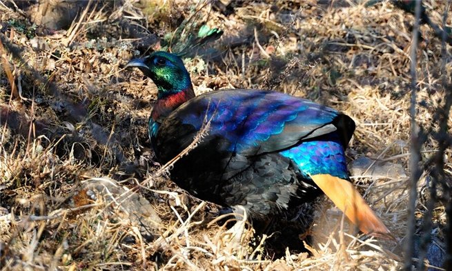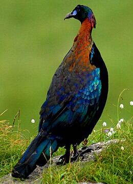 體形較家雞肥大的是棕尾虹雉,雄鳥羽冠長,而具匙狀羽端,上體大都呈金屬銅綠、紫及綠藍等色。下背白,尾棕色,下體褐黑色。分布于西藏南部、東南部、雅魯藏布江東部,在該地為留鳥。
