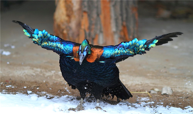 虹雉,這類雄鳥,以羽毛閃著金屬輝亮為著,故名虹雉。走禽。體結實,體形肥大,喙略長,上鳥喙略大并覆蓋著下鳥喙,先端微向下曲,但不具鉤,適于啄食植物種子;臉部裸露。尾較翅短,寬闊扁平,雄鳥末端幾乎呈方形而雌鳥稍呈圓形,具18枚尾羽。翼短圓,不善飛;腳強健,具銳爪,善于行走和掘地尋食;雄鳥具大的肉冠和美麗的羽毛;鼻孔不為羽毛所掩蓋著。翅稍短圓。跗蹠裸出,或僅上部被羽,雄性常具短距,趾完全裸出,后趾位置較高于他趾。雌雄異色,雄者羽色華麗。