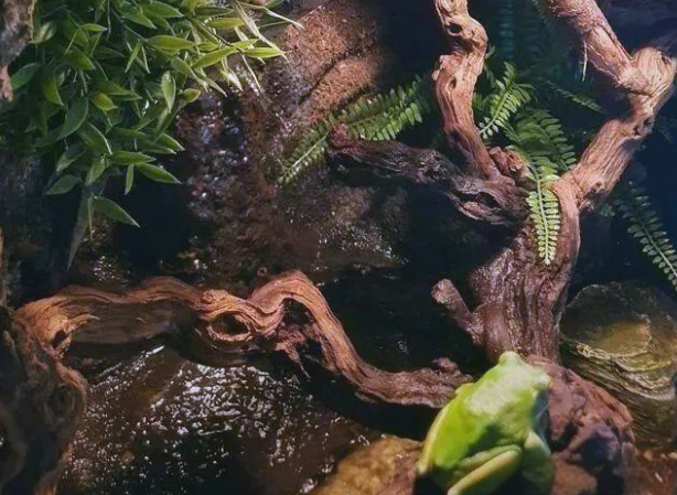 如果樹蛙并未因缺鈣而活動受限,但仍然表現出不愿爬高的行為,這可能與其所處的環境有關。在過于寬敞、垂直或光滑的環境中,例如光滑的塑料或玻璃表面,隨著樹蛙年齡的增長,其體重也會顯著增加。這可能導致樹蛙在嘗試攀爬時,因自重而下滑,進而產生長期的“失敗”體驗。這種持續的挫折感可能讓樹蛙逐漸喪失了攀爬的意愿,最終只能“無奈”地長期生活在潮濕的地面上。因此,在環境中應合理配置斜放且寬大的攀爬物,其寬度需超過樹蛙的體寬,以便它們能夠相互堆疊,營造出隱蔽的區域。這樣的設計能讓樹蛙在空中找到適合自己的位置,從而避免在潮濕的地面上長時間逗留。